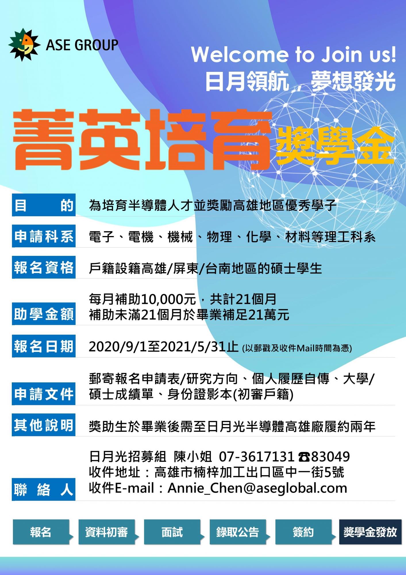 日月光菁英培育獎學金,刊登活動資訊 ,申請中! [本系] 2020-10-21 AdminAdmin 備註: 有問題者,可直接詢問施孟鎧老師 日月光菁英培育獎學金 日月光半導體2020年獎學金申請辦法.pdf