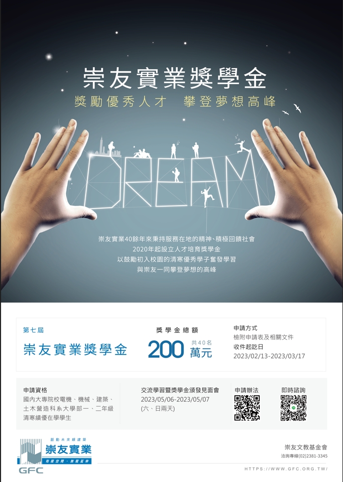 【獎助學金】第七屆崇友實業獎學金 2023-02-07 AdminAdmin 2023 崇友實業獎學金海報 2023 崇友實業獎學金海報 2023年度崇友實業獎學金申請書.doc 2023年崇友實業獎學金申請辦法.pdf